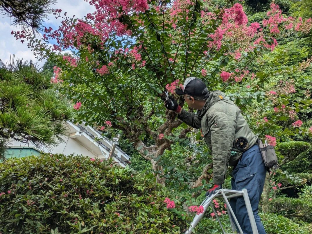 今回は、花の終わりに向けてのサルスベリ剪定。春から伸びて花をつけた枝を、根元からしっかり切り戻すことで、来年も美しい樹形を保つことができます。