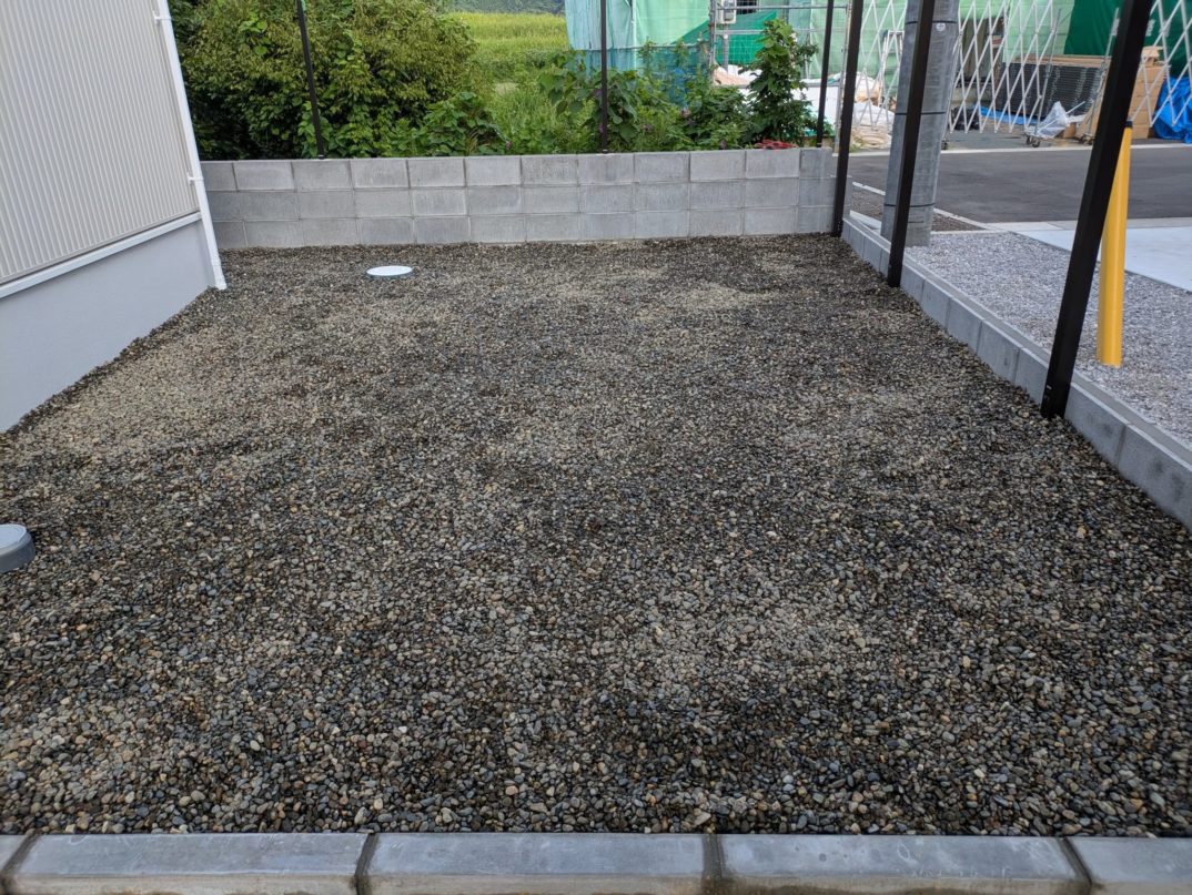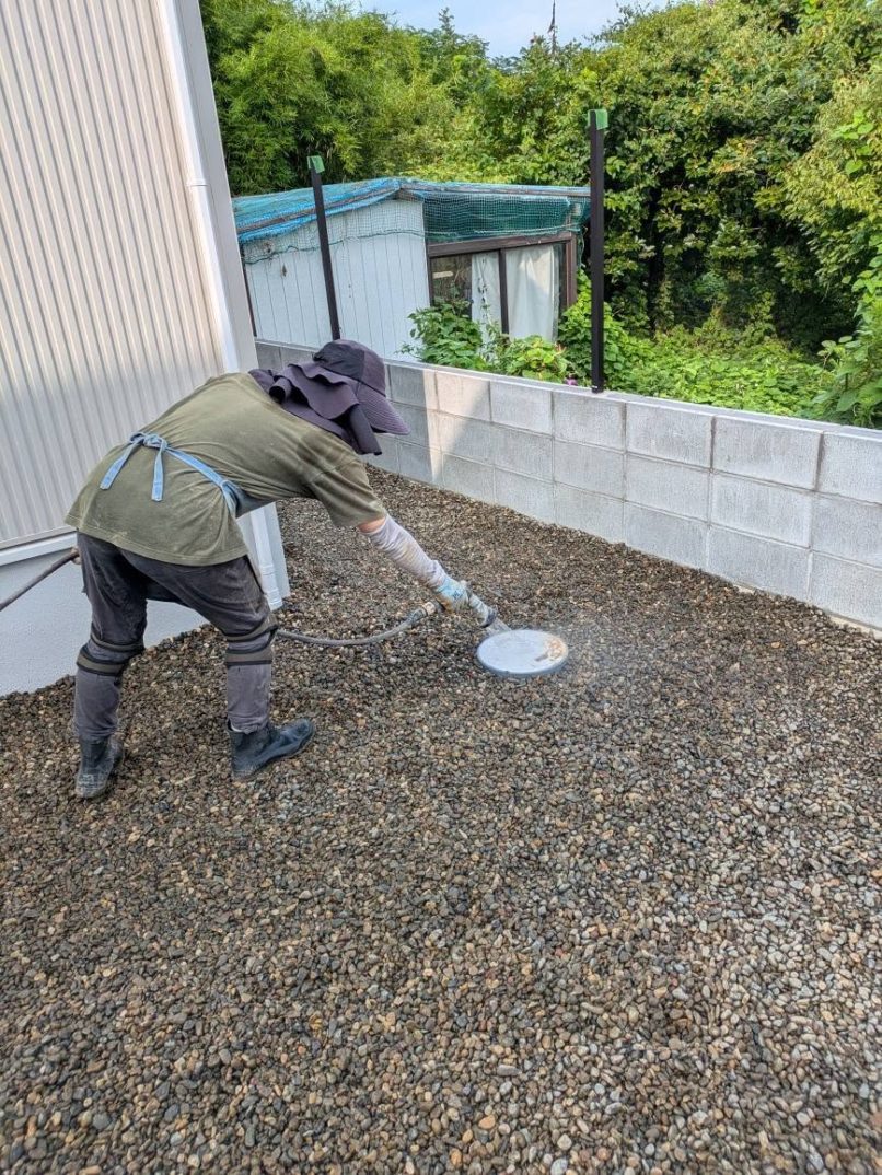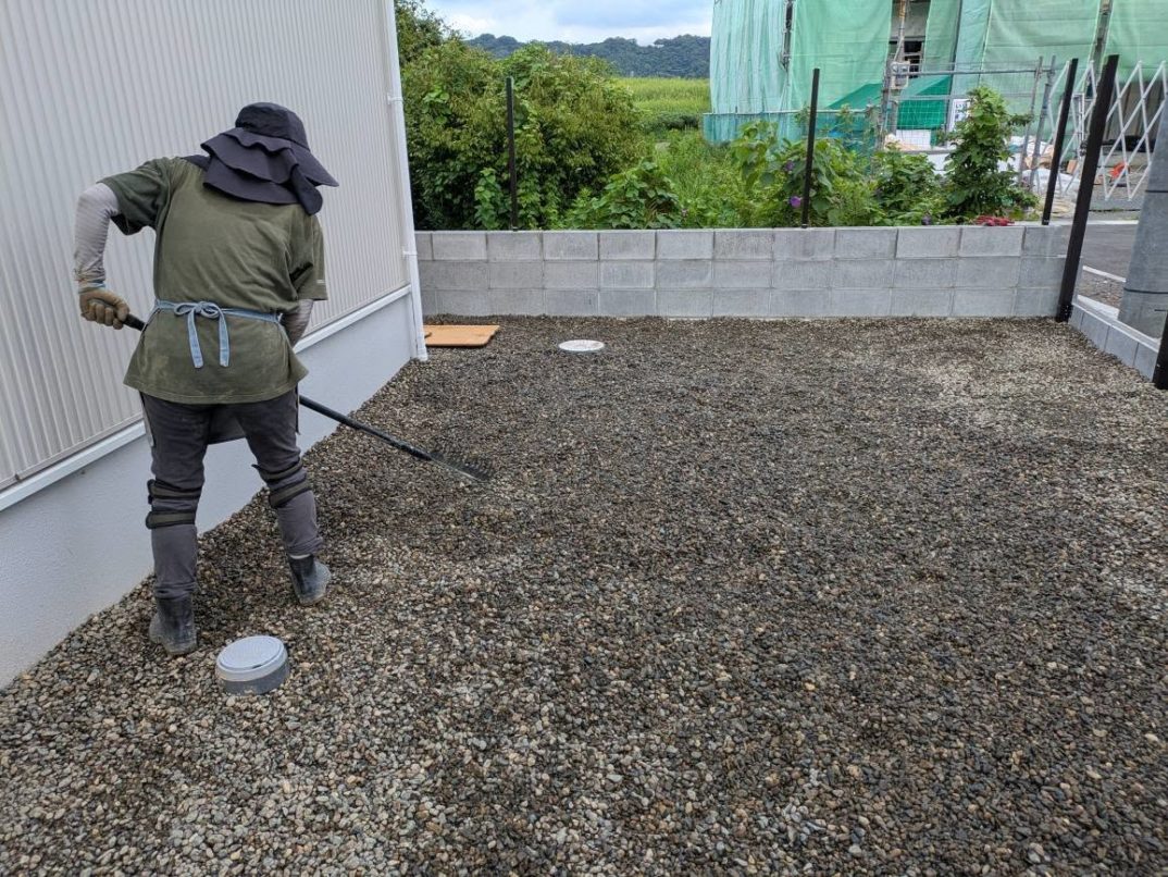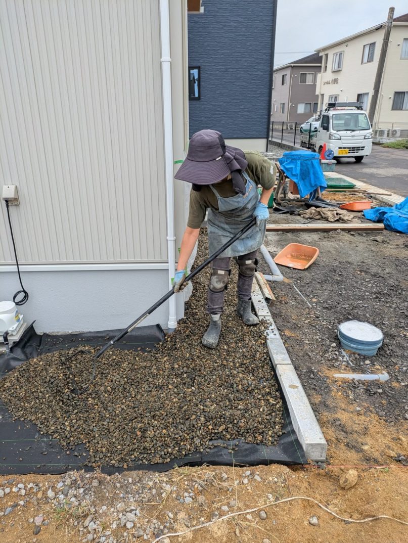 11日目の本日は、駐車場以外の左官作業として最後となる縁石の設置を朝一番で完了。その後は豆砂利敷き作業に入りました。