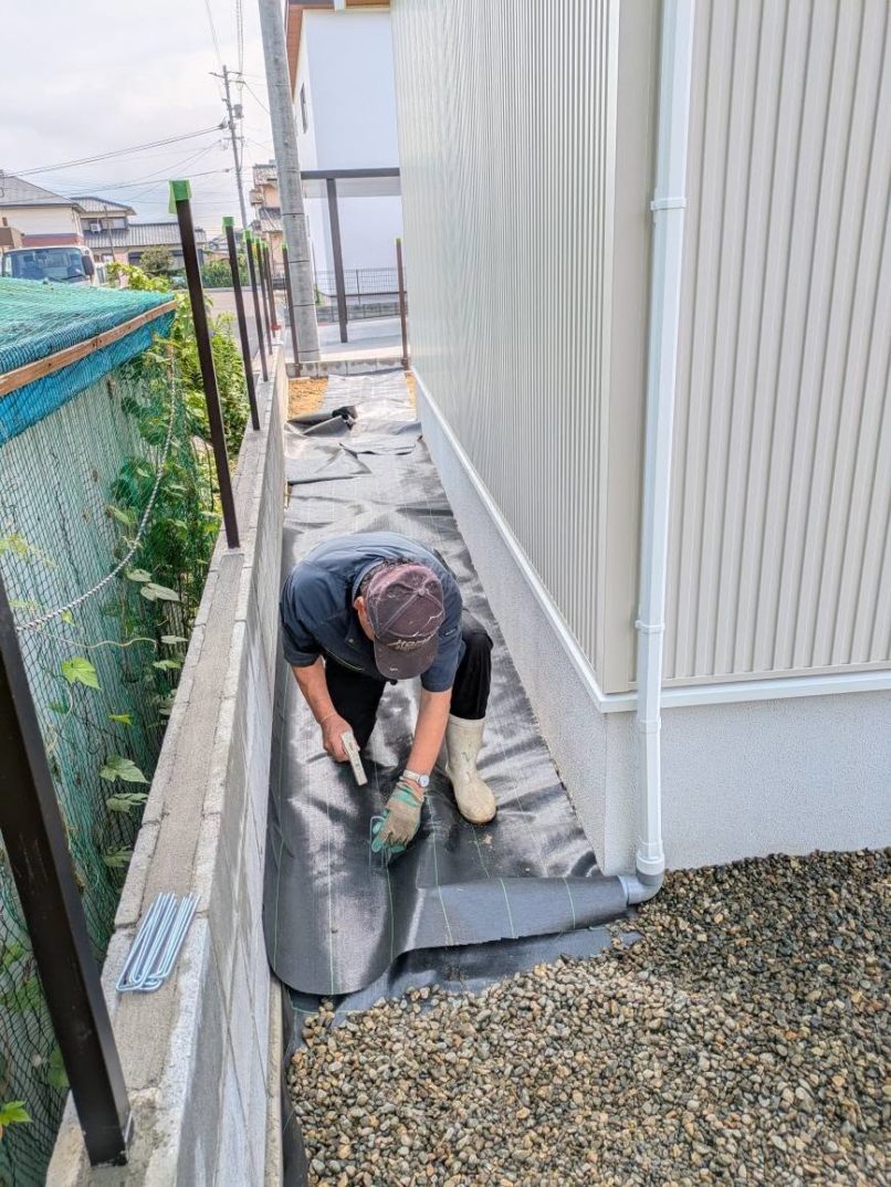 まずは防草シートを全体に丁寧に敷設し、雑草対策を万全に。その上から、ユンボでトラックから砂利を1輪車へ移し、手作業で庭全体へ敷き詰める作業を進めていきます。