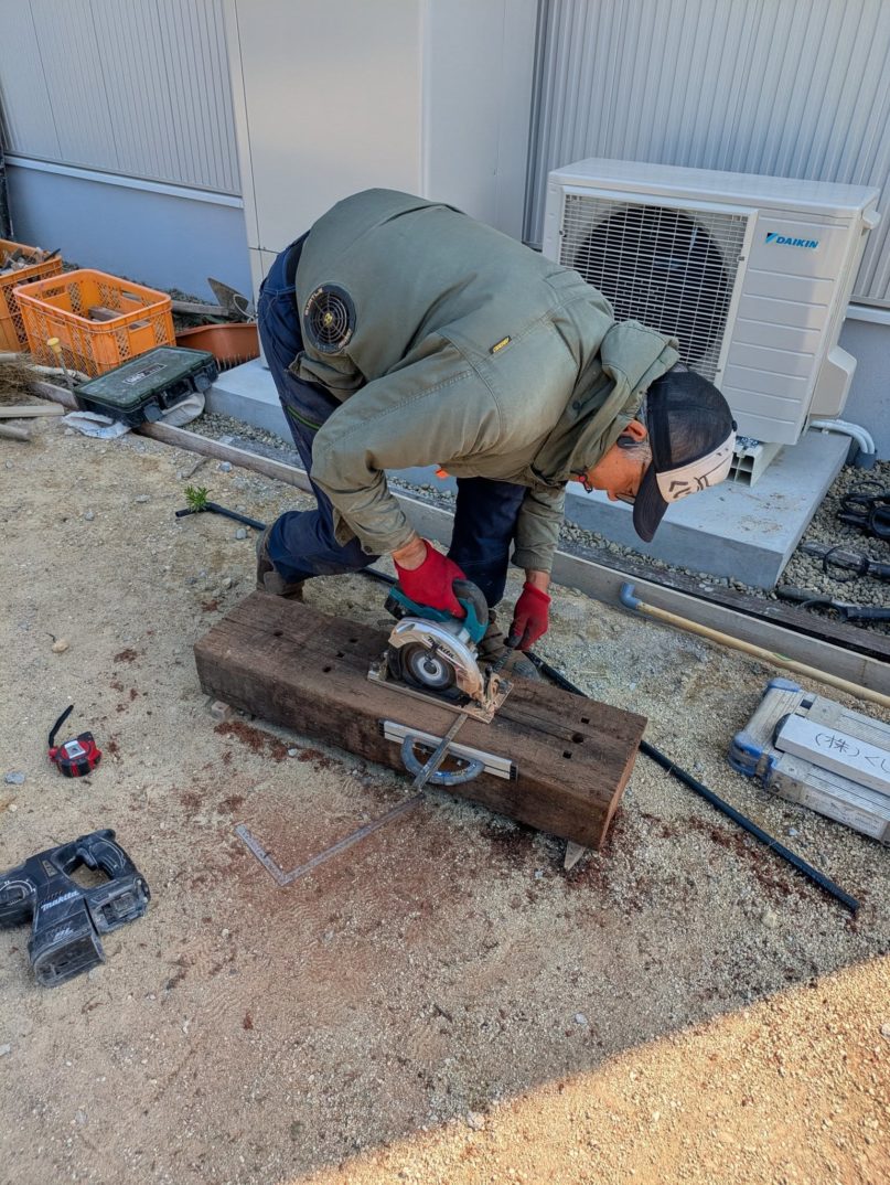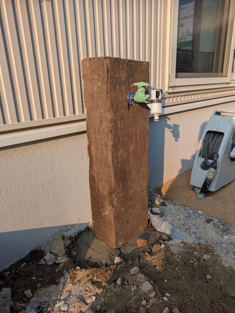 また、今回は枕木を使った立水栓を製作。裏面に溝を掘り、上下にドリルで穴を開けてパイプを通し、蛇口を取り付けました。仕上げは後日レンガと石貼りでパンを製作する予定です。