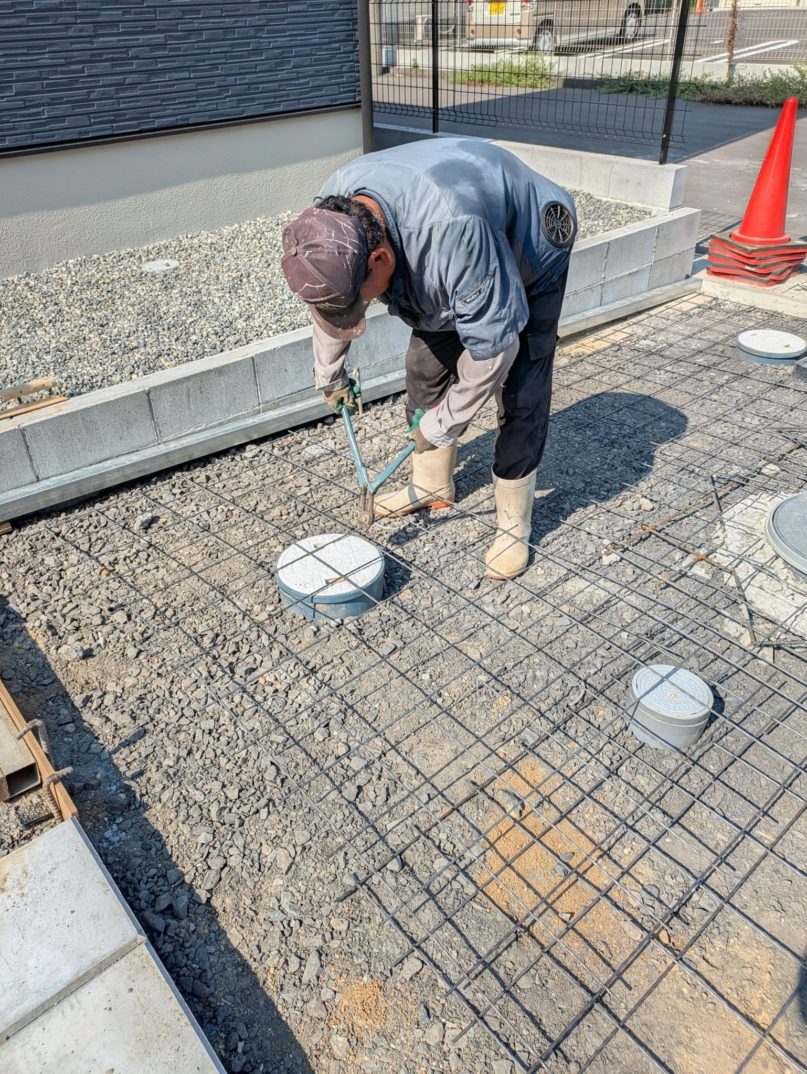 まずは駐車場スリット位置を鋼管で設定し、これを基準にクラッシャーランの高さを調整して転圧。さらにスクリューメッシュを設置し、生コン打設の下準備が完了しました。