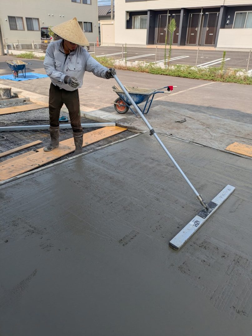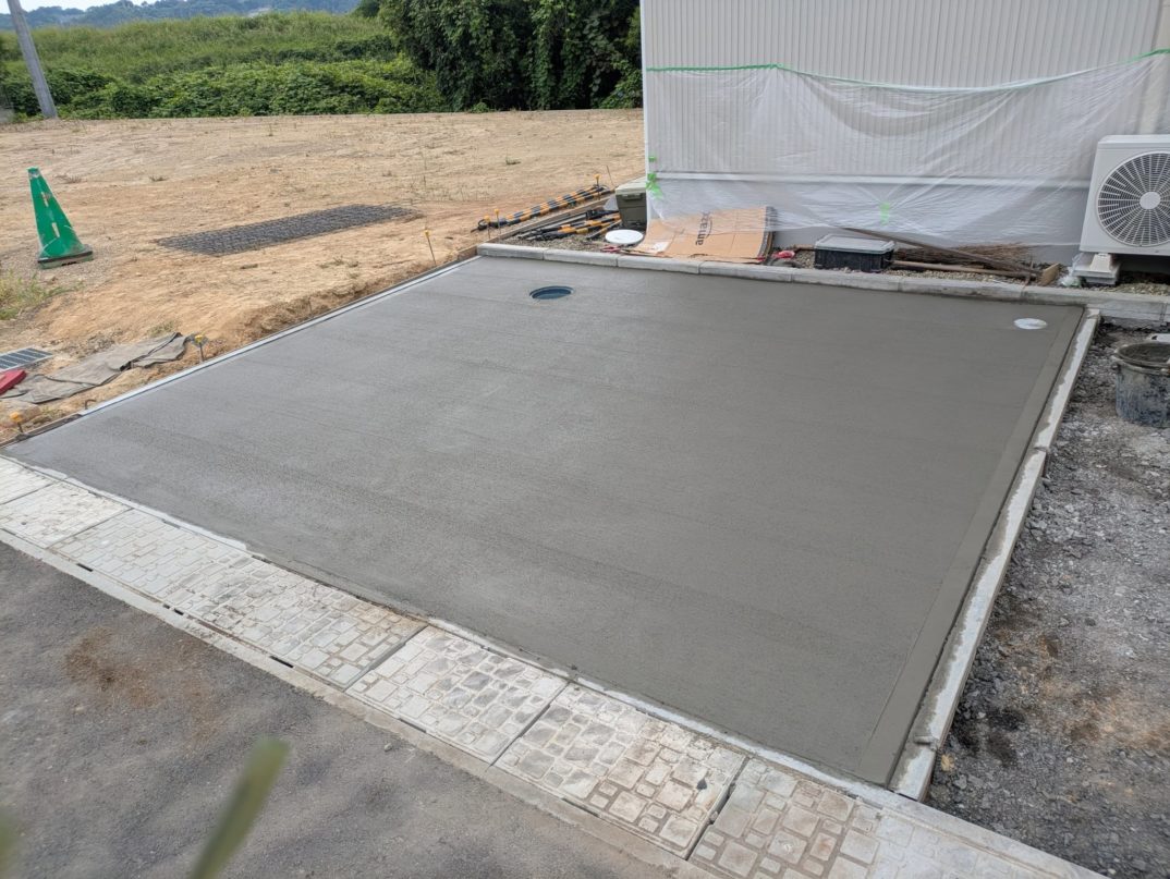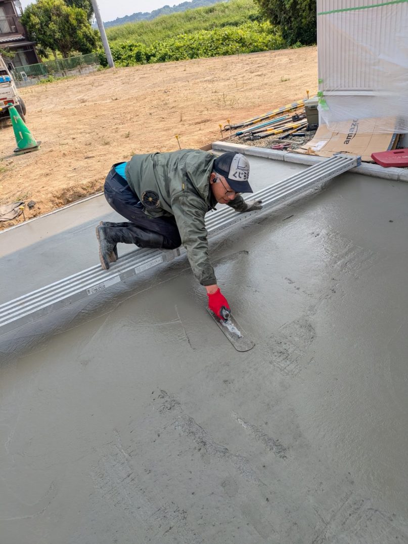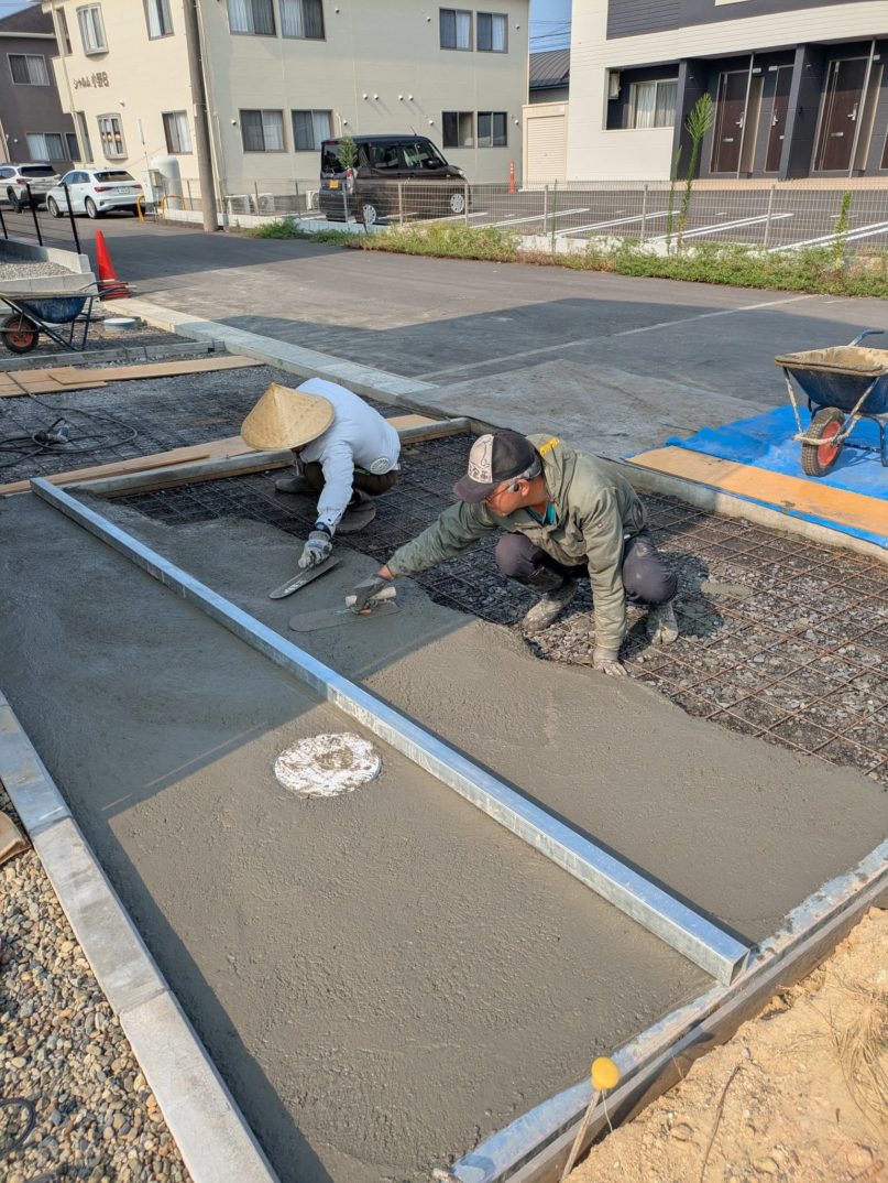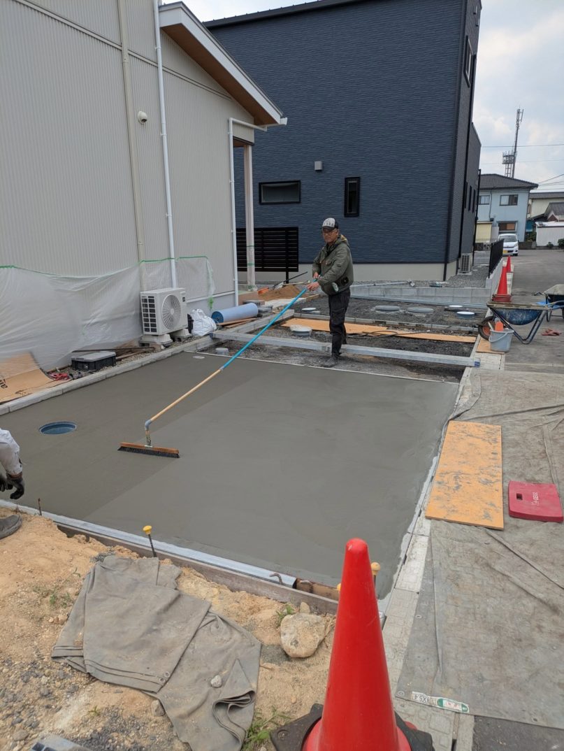 本日は、O様邸外構工事における駐車場コンクリート打設の前半工程を実施しました。朝から2時間ほどかけて、まずは一面の打設と金ゴテ仕上げを行い、昼休憩後にもう一面の打設へと進みました。