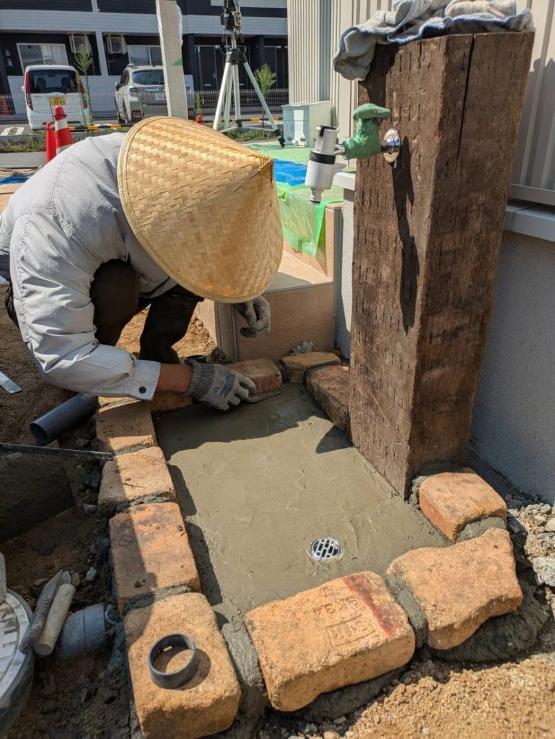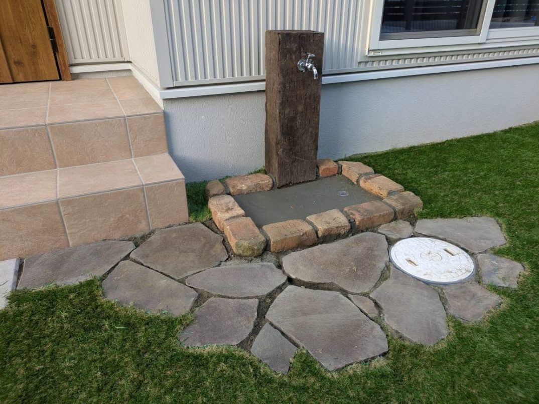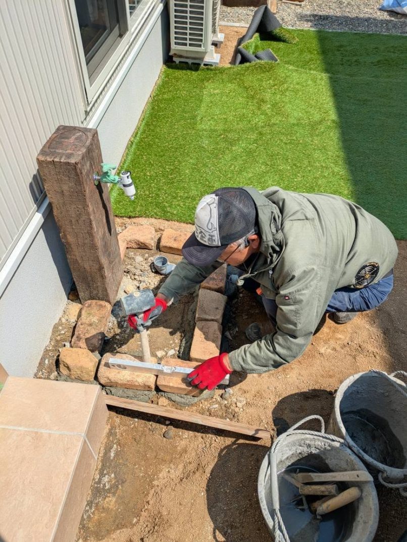 午後からは、立水栓のパン製作と人工芝の施工に入りました。パン部分にはレンガで縁を設け、中央には石貼りを施しています。目地は後日改めて作業させていただく予定です。