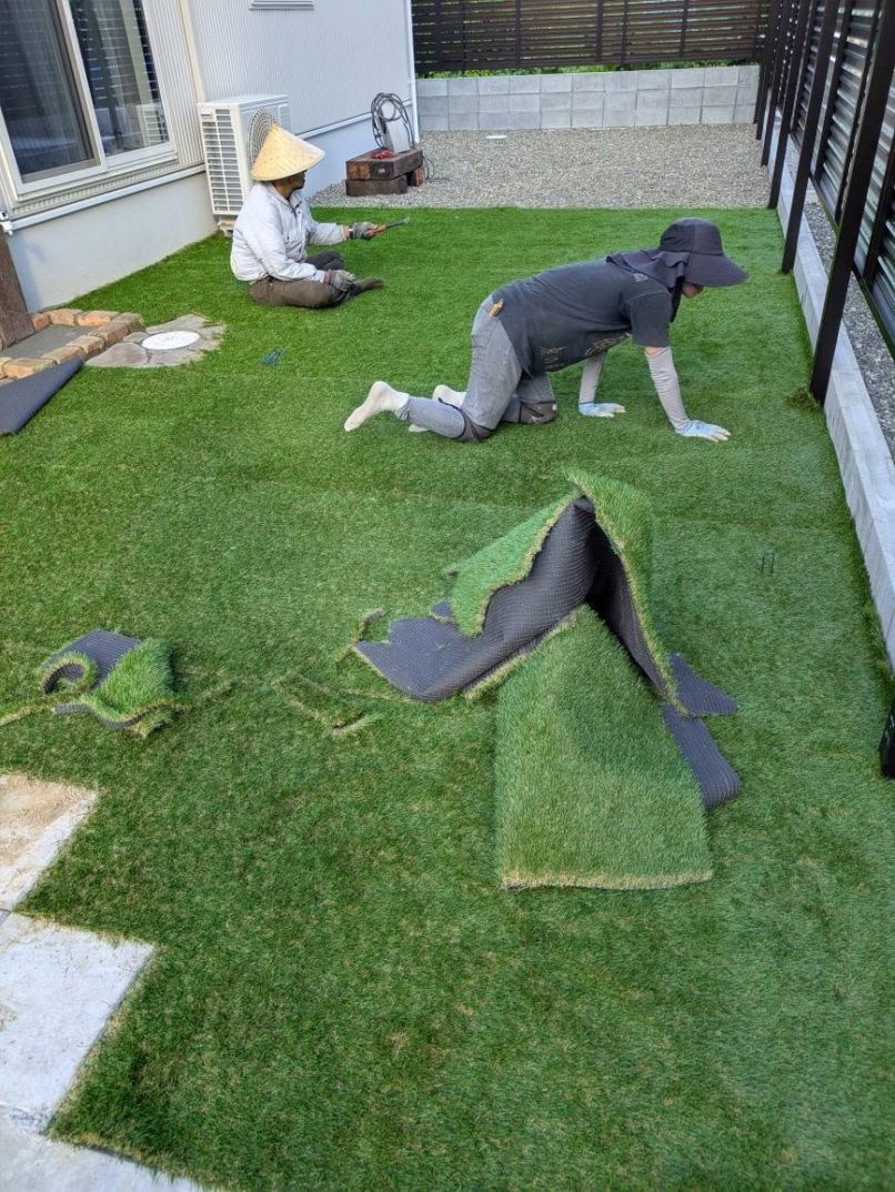 人工芝については、まず真砂土で丁寧に下地を整地し、レベルを確認してから芝を敷き詰めました。その後、均等な間隔で芝を杭打ちして固定しております。