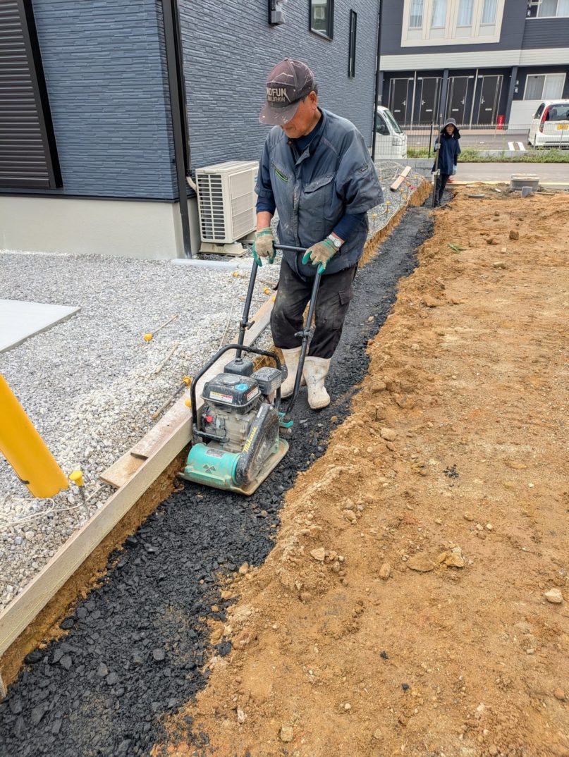 砕石をしっかりと敷き詰め、プレートコンパクターで丁寧に転圧することで、今後のブロック積みやコンクリート打設に必要な安定した下地をつくることができます。
